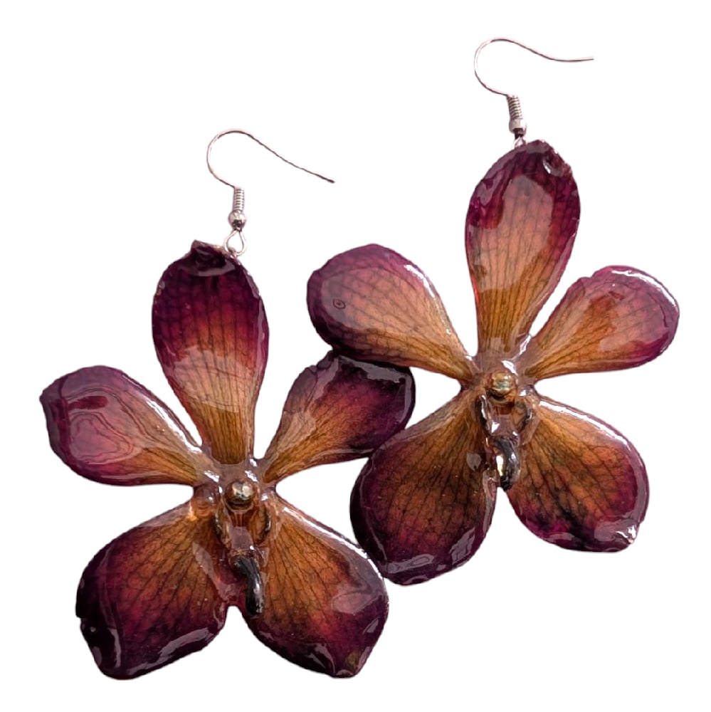 A perfect pair of mokara orchid blooms, beautifully preserved in botanical grade resin, hung on stainless steel shepherds hook style earrings. Approximately 6x7cm.